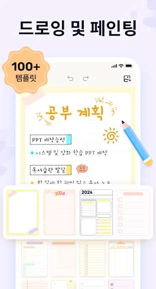 녹음 기능과 필기 싱크 기능은 특히 강의나 회의 내용을 정리할 때 유용하며, 템플릿을 추가해 나만의 플래너를 제작할 수 있습니다. 클라우드 연동을 지원하여 어디서든 파일을 관리할 수 있으며, 삼성 태블릿과 S펜 지원을 통해 태블릿에서도 뛰어난 필기감을 제공합니다.
