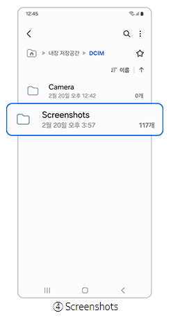 - 파일 관리 앱 경로: 내 파일 > 내장 저장공간 > DCIM > Screenshots
