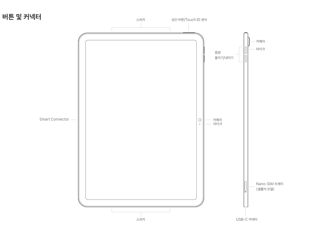 버튼 및 커넥터 스피커, 상단 버튼/Touch ID 센서, 마이크, 음량 올리기/내리기 버튼, 카메라, Nano-SIM 트레이 (셀룰러 모델), Smart Connector, USB‑C 커넥터