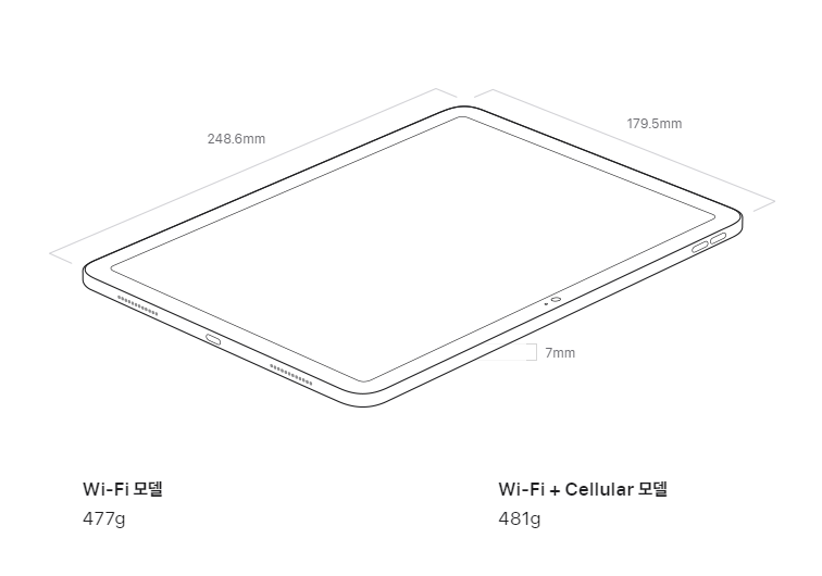 무게 Wi‑Fi 모델: 477g , Wi‑Fi + Cellular 모델: 481g