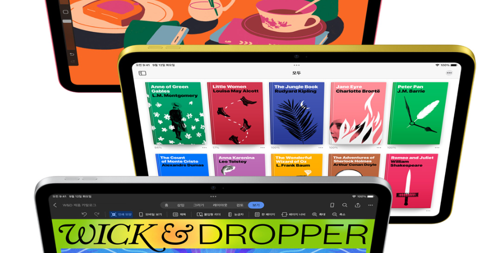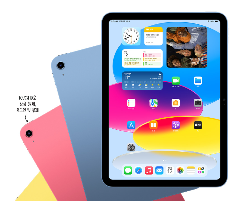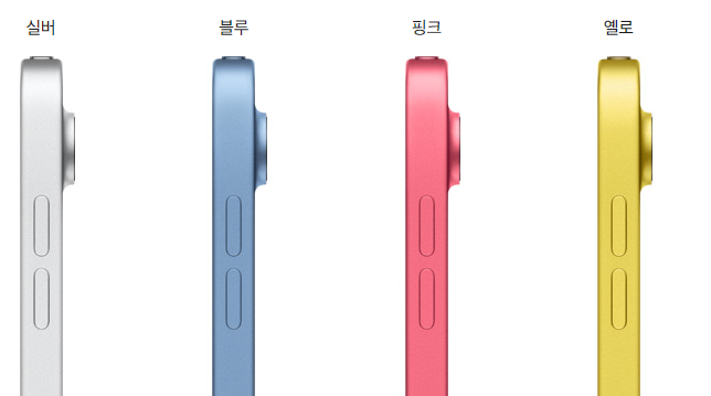 아이패드 10세대는 블루, 핑크, 옐로, 실버 4가지 색상으로 출시되었습니다.