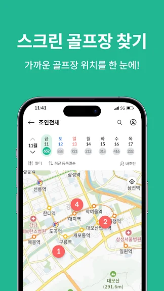 앱의 주요 기능으로는 원하는 골프 조인을 설정하고 참여자를 모집하거나, 근처 골퍼와 즉석으로 스크린 골프 번개를 열 수 있는 서비스가 포함되어 있습니다. 또한, 인기 순위, 접속 순위, 위치 기반 검색을 활용해 나에게 맞는 골프 친구를 찾아볼 수 있습니다.