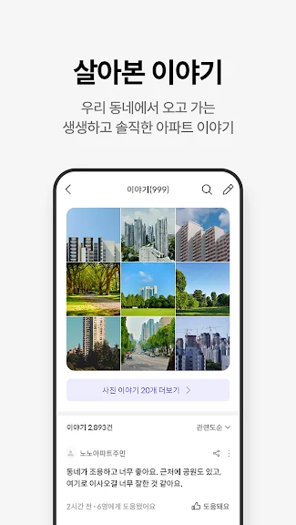 또한, "단지톡" 기능을 통해 사용자들은 거주지에 대한 의견을 나누거나 사진을 찍어 단지의 대표사진으로 등록할 수 있습니다. 입지 정보는 초세권, 역세권 등 다양한 지역 정보를 제공하며, 부동산 관련 뉴스와 전문가 콘텐츠도 함께 제공됩니다.