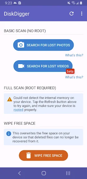 * 장치가 루팅되지 않은 경우 앱은 캐시 및 썸네일을 검색하여 삭제된 사진 또는 비디오에 대해 "제한된" 스캔을 수행합니다.