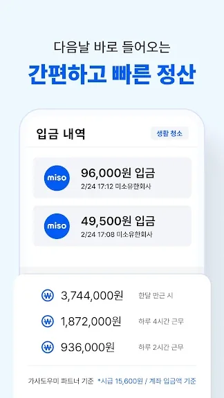 - 일한 다음 날 바로 급여를 지급 받을 수 있어요