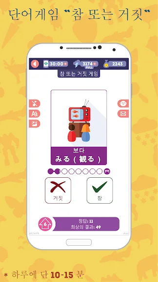 과거 자료 검토 많은 좋은 앱은 이전 공부를 리뷰하는 데 주의를 충분히 기울이지 않습니다. 이를 위해 "참 또는 거짓"라는 단어게임을 만들었습니다. 매우 간단하지만 중독성이 있으며 가장 중요한 것은 과거자료를 반복하고 절대 잊지 않도록 도와 준다는 것입니다!