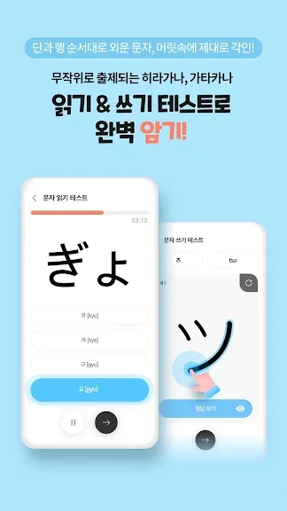 - 히라가나/가타카나/문자 테스트 중 학습하고자 하는 단계 선택 가능