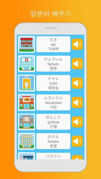 일본어 학습용 앱을 사용하여 대화, 숫자, 취미, 숙박 시설, 형용사, 동물, 색상, 옷, 국가, 길 찾기, 응급 상황, 음식, 언어 문제, 질문, 구문, 문장 및 기타 단어를 포함한 숙어집 세트를 배울 수 있습니다.