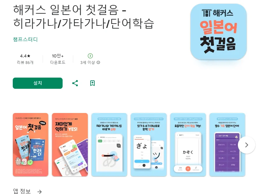 아래는 해커스 일본어 첫걸음 - 히라가나/가타가나/단어학습 어플에 대한 스크린샷 정보입니다.