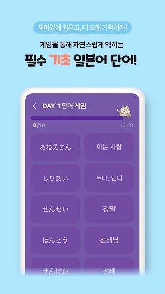 매일 새로운 단어와 일본어를 학습하고 배울 수 있으며 게임 섹션에서 연습할 수 있습니다.