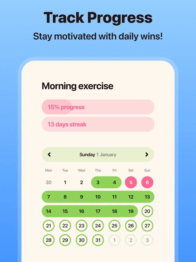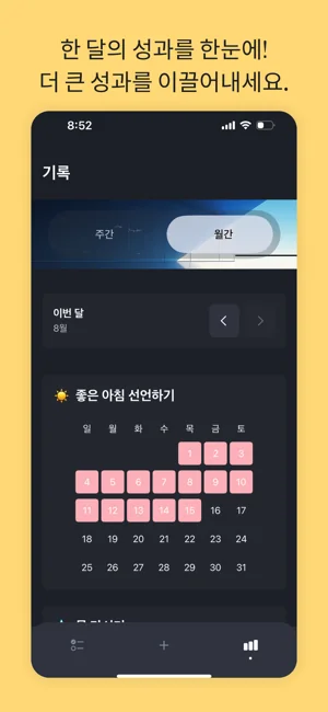 진행 상황을 정확하게 추적하고 인상적인 습관 완료 기록을 세우세요. 연속 기록이 길수록 습관을 유지하려는 의욕이 더 강해집니다.