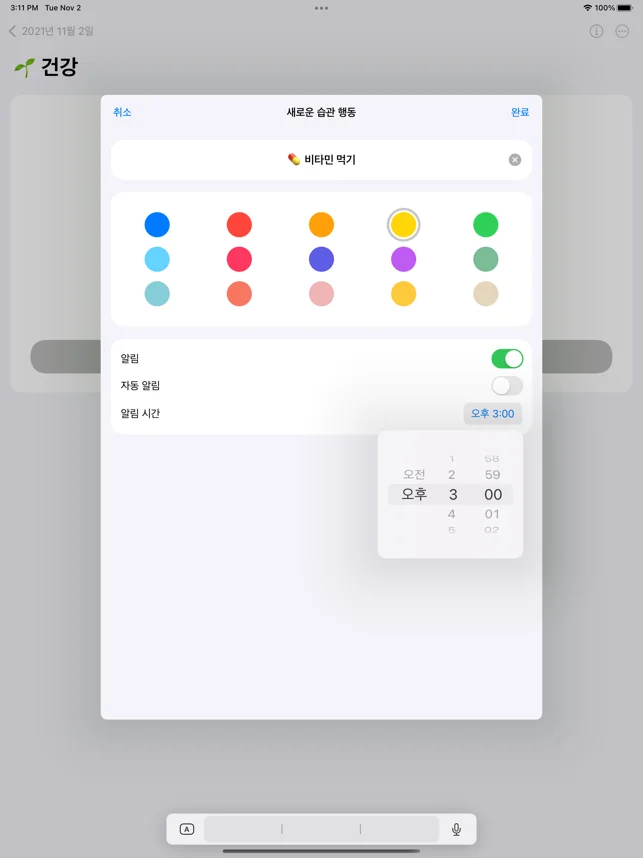 여러분은 습관을 명명하고, 독특한 아이콘을 선택할 수 있고, 심지어 그 습관을 색깔로 선택할 수도 있어요.