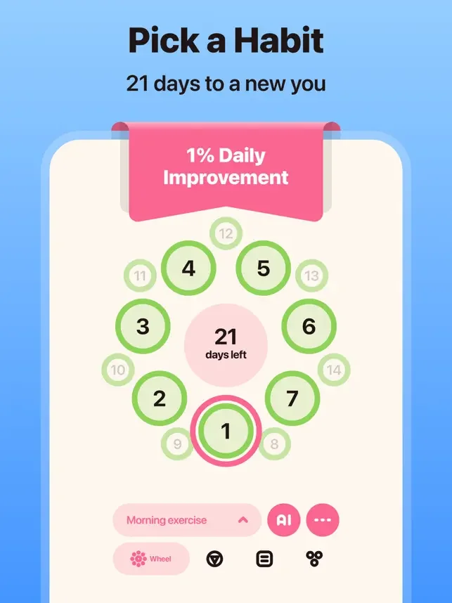 The routine ("Habit Wheel"). The Habit Wheel is an innovative feature that allows you to visualize your weekly habits and goals. You can track your progress and set reminders to stay on track with your goals. The Habit Wheel is a great way to visualize your habits.