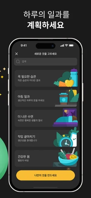 하루 중 시간과 생활의 다양한 측면에 따라 습관을 손쉽게 만들고 분류하여 일상에 원활하게 통합하세요.