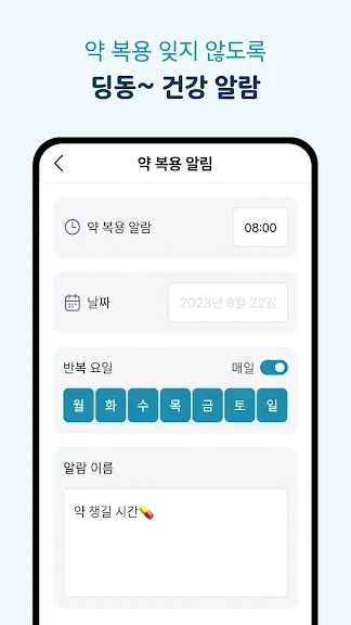 정기적으로 먹는 약은 투약 일정을 저장해 보세요. 오늘 복용해야 되는 약을 한눈에 알아볼 수 있게 보여드립니다.