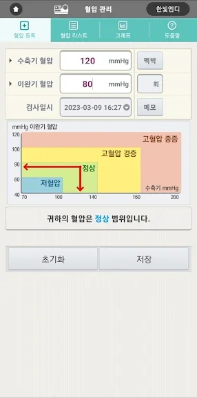 - 혈압을 기록관리하고 누적된 혈압결과를 그래프로 보여주어 혈압변화를 평가하는 메뉴입니다.