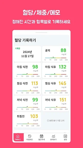 - 세분화 된 공복/아침/점심/저녁 식전, 식후 혈당 기록