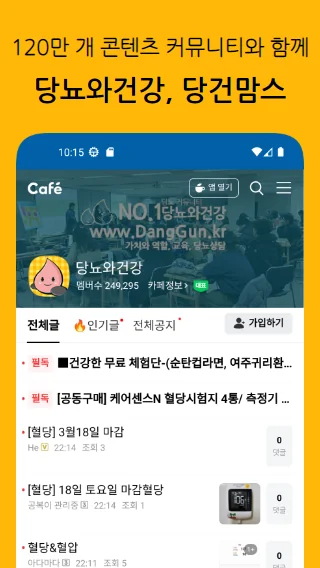 네이버 카페 당뇨와건강, 당건맘스와 공유기능, 운동, 혈당기록 보내기, 원하는 정보만 공유 선택 기능, 당건 카페에 최적화된 전용 앱입니다.
