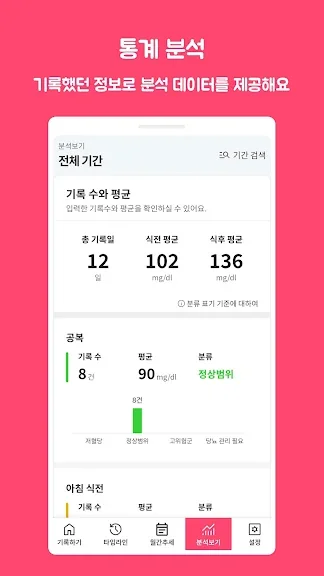 대시보드에서 최근 혈당 기록을 분석한 그래프와 표를 볼 수 있습니다. 혈당이 목표 범위 내에 머물러 있는지, 식전과 식후의 혈당 변화도 한 눈에 확인하세요.