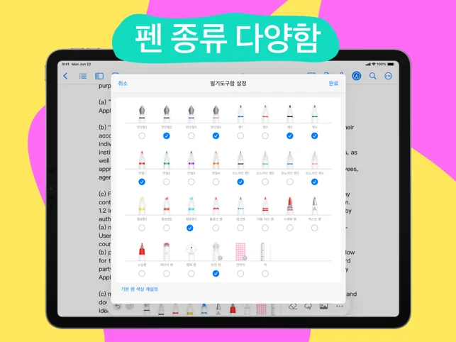 ● 점선, 물결선, 더블 라인, 만년필, 형광펜, 연필, 수채화 펜 등 상황에 맞는 다양한 종류와 32가지 색상의 펜 보유