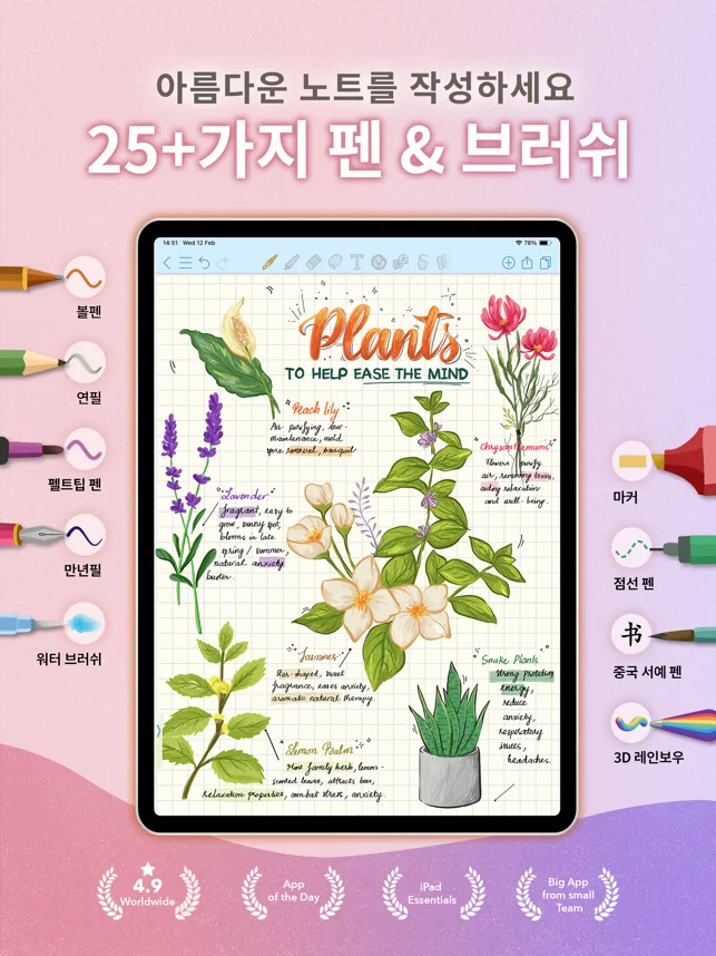 - 25개 이상의 다양한 펜과 브러시로 노트를 예술 작품으로 변형하세요.
