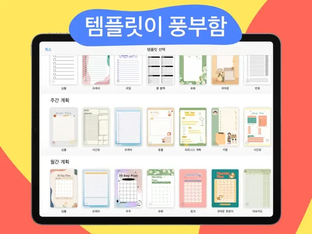 또한 꾸준히 업데이트되는 유용한 템플릿 라이브러리(일간, 주간, 월간 플래너)를 통해 나만의 다이어리를 꾸미는 재미도 즐기실 수 있습니다.