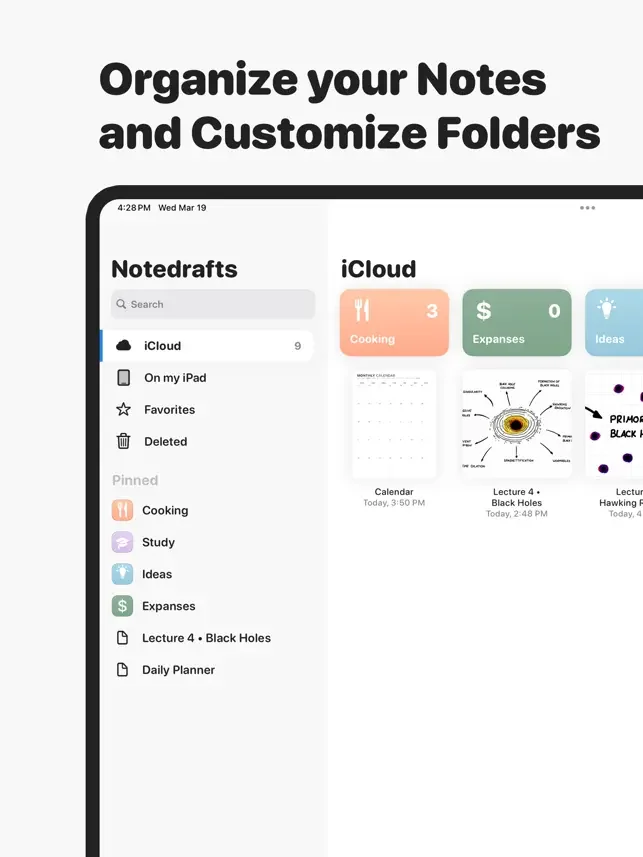 Notedrafts is a powerful note-taking app that lets you write, draw, and organize your thoughts across different types of documents. Whether you're marking up a PDF, writing on a large canvas, or taking notes in a long vertical layout, Notedrafts adapts to your workflow.