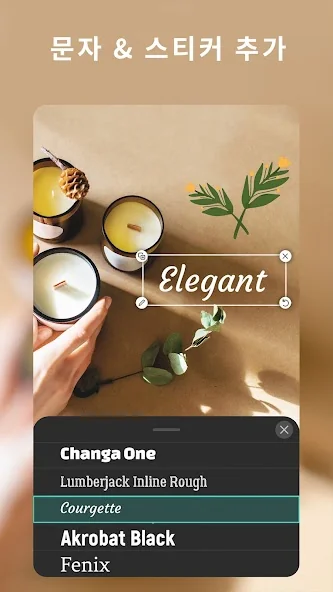 • 200여 개의 디자이너 폰트(한글 폰트 포함)로 사진에 텍스트 추가