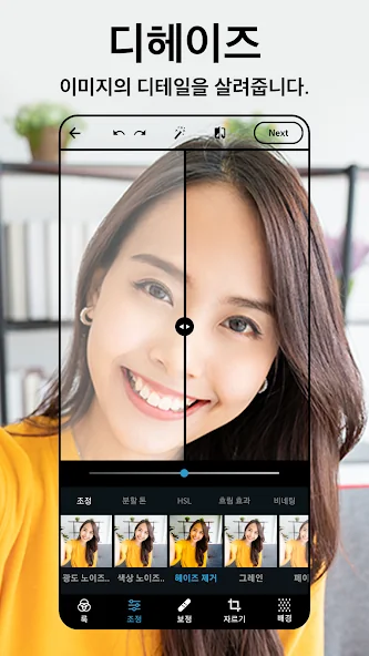 필터에서 몸매 보정까지. 동영상 편집으로 예쁘게 보정한 후에도 화질 저하는 걱정하지 마세요. 화질 복구로 예쁘고 또렷한 동영상 편집이 가능해요.